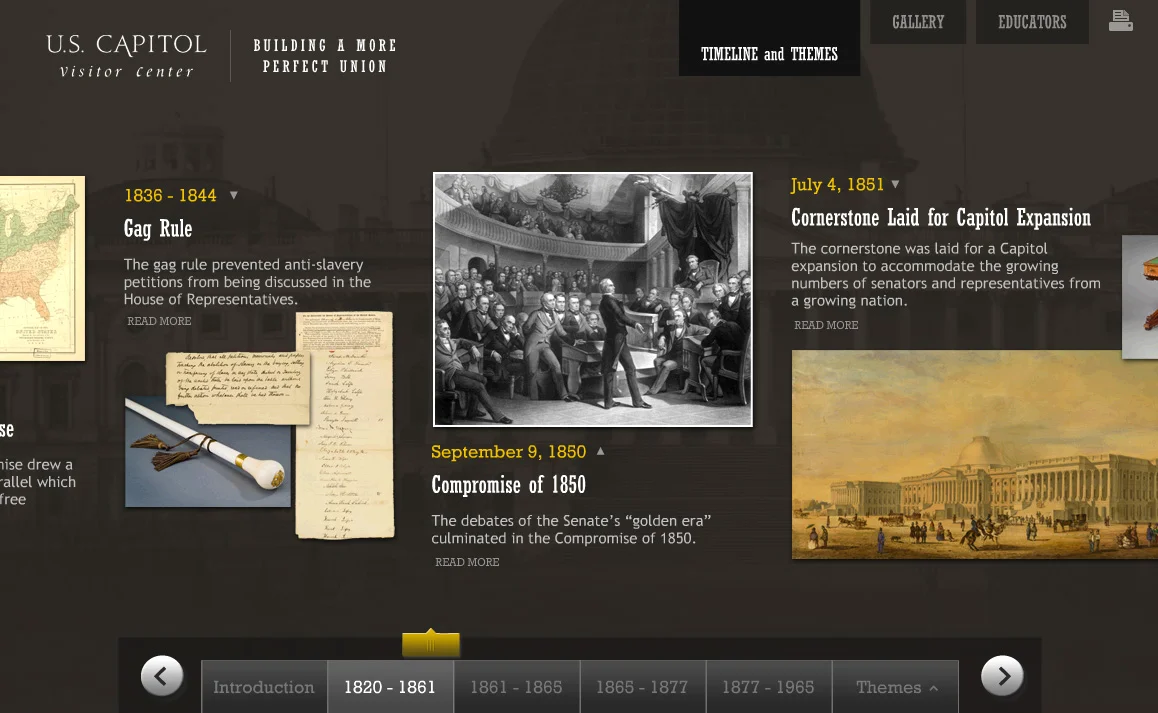 This online exhibition for the U.S. Capitol Visitor Center examines the story of the Capitol during the years surrounding the Civil War. Throughout this important period in our country’s history—and continuing into today—the Capitol remains an enduring symbol of our nation’s unity. This site explores how the Capitol expanded at the very time our country was splitting apart and the legislative efforts that sought to mend our fractured nation. As Abraham Lincoln said about the construction of the Capitol's iconic dome, “If people see the Capitol going on, it is a sign we intend the Union shall go on.”