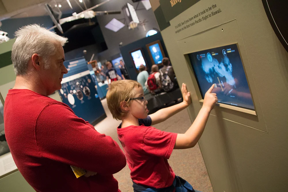 The interactive displays here aim to give you a tactile sense of navigation: there are touch screens on which you can steer a craft through space or learn when to apply various navigation methods to air travel. … [The] most effective interactive display may be the [one with] simple sextants pointed at … stars on the wall, which you can use to determine a star’s angle of elevation.